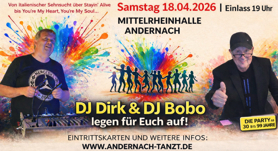 06.September 2024 steigt in der Andernacher Mittelrheinhalle diese Tanzparty. Beginn ist um 20 Uhr (Einlass ab 19 Uhr, Ende um 01:00 Uhr) Alles Damen, die bis 20.00Uhr da sind, erhalten ein Glas